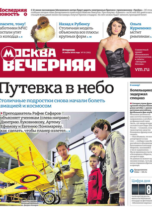 «Вечерняя Москва» — ежедневная российская вечерняя газета, старейшее из вечерних изданий в России, учрежденное в 1923 году. Выходит пять дней в неделю, кроме субботы и воскресенья. Отличается тем, что рассказывает о событиях еще не завершившегося дня. Оперативно освещает хронику и особенности жизни Москвы, охватывает все слои общества и большинство профессиональных и возрастных групп читателей.Издание представлено тремя выпусками – утренним ежедневным, вечерним (выходит три раза в неделю), еженедельным (выходит по четвергам).